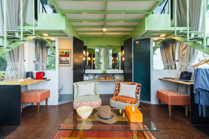 Identical to the land version, also with eco-friendly furniture, the Floating Jungloo is buoyed up by a combination of recycled plastic tanks and bamboo.